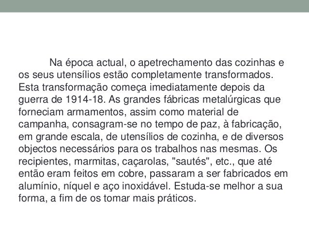 18. 18. Na época actual, o apetrechamento das cozinhas e os seus utensílios estão completamente transformados. Esta transformação começa imediatamente depois da guerra de 1914-18. As grandes fábricas metalúrgicas que forneciam armamentos, assim como material de campanha, consagram-se no tempo de paz, à fabricação, em grande escala, de utensílios de cozinha, e de diversos objectos necessários para os trabalhos nas mesmas. Os recipientes, marmitas, caçarolas, "sautés", etc., que até então eram feitos em cobre, passaram a ser fabricados em alumínio, níquel e aço inoxidável. Estuda-se melhor a sua forma, a fim de os tomar mais práticos.