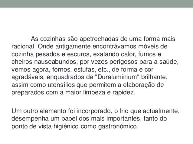 19. 19. As cozinhas são apetrechadas de uma forma mais racional. Onde antigamente encontrávamos móveis de cozinha pesados e escuros, exalando calor, fumos e cheiros nauseabundos, por vezes perigosos para a saúde, vemos agora, fornos, estufas, etc., de forma e cor agradáveis, enquadrados de "Duraluminium" brilhante, assim como utensílios que permitem a elaboração de preparados com a maior limpeza e rapidez. Um outro elemento foi incorporado, o frio que actualmente, desempenha um papel dos mais importantes, tanto do ponto de vista higiénico como gastronómico.