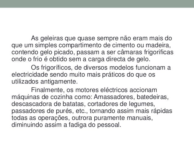 20. 20. As geleiras que quase sempre não eram mais do que um simples compartimento de cimento ou madeira, contendo gelo picado, passam a ser câmaras frigorificas onde o frio é obtido sem a carga directa de gelo. Os frigoríficos, de diversos modelos funcionam a electricidade sendo muito mais práticos do que os utilizados antigamente. Finalmente, os motores eléctricos accionam máquinas de cozinha como: Amassadores, batedeiras, descascadora de batatas, cortadores de legumes, passadores de purés, etc., tornando assim mais rápidas todas as operações, outrora puramente manuais, diminuindo assim a fadiga do pessoal.