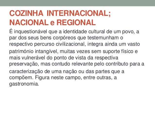 21. 21. COZINHA INTERNACIONAL; NACIONAL e REGIONAL É inquestionável que a identidade cultural de um povo, a par dos seus bens corpóreos que testemunham o respectivo percurso civilizacional, integra ainda um vasto património intangível, muitas vezes sem suporte físico e mais vulnerável do ponto de vista da respectiva preservação, mas contudo relevante pelo contributo para a caracterização de uma nação ou das partes que a compõem. Figura neste campo, entre outras, a gastronomia.