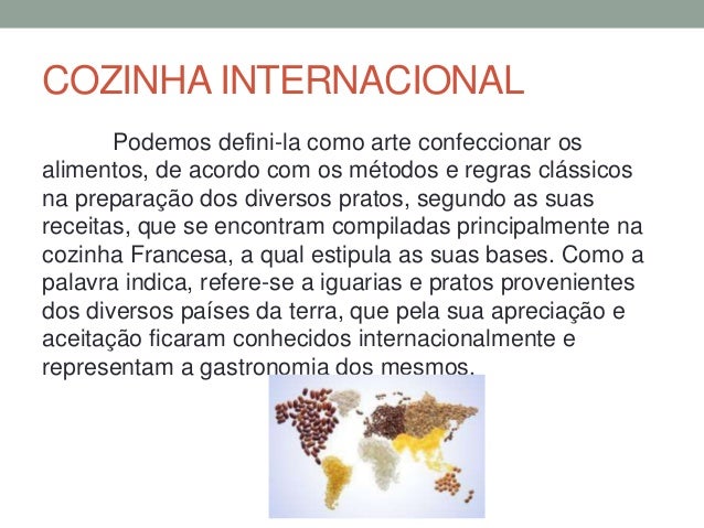 22. 22. COZINHA INTERNACIONAL Podemos defini-la como arte confeccionar os alimentos, de acordo com os métodos e regras clássicos na preparação dos diversos pratos, segundo as suas receitas, que se encontram compiladas principalmente na cozinha Francesa, a qual estipula as suas bases. Como a palavra indica, refere-se a iguarias e pratos provenientes dos diversos países da terra, que pela sua apreciação e aceitação ficaram conhecidos internacionalmente e representam a gastronomia dos mesmos.