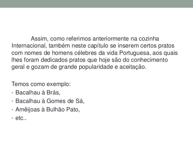 25. 25. Assim, como referimos anteriormente na cozinha Internacional, também neste capítulo se inserem certos pratos com nomes de homens célebres da vida Portuguesa, aos quais lhes foram dedicados pratos que hoje são do conhecimento geral e gozam de grande popularidade e aceitação. Temos como exemplo: • Bacalhau à Brás, • Bacalhau à Gomes de Sá, • Amêijoas à Bulhão Pato, • etc..