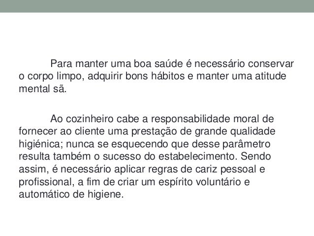 29. 29. Para manter uma boa saúde é necessário conservar o corpo limpo, adquirir bons hábitos e manter uma atitude mental sã. Ao cozinheiro cabe a responsabilidade moral de fornecer ao cliente uma prestação de grande qualidade higiénica; nunca se esquecendo que desse parâmetro resulta também o sucesso do estabelecimento. Sendo assim, é necessário aplicar regras de cariz pessoal e profissional, a fim de criar um espírito voluntário e automático de higiene.