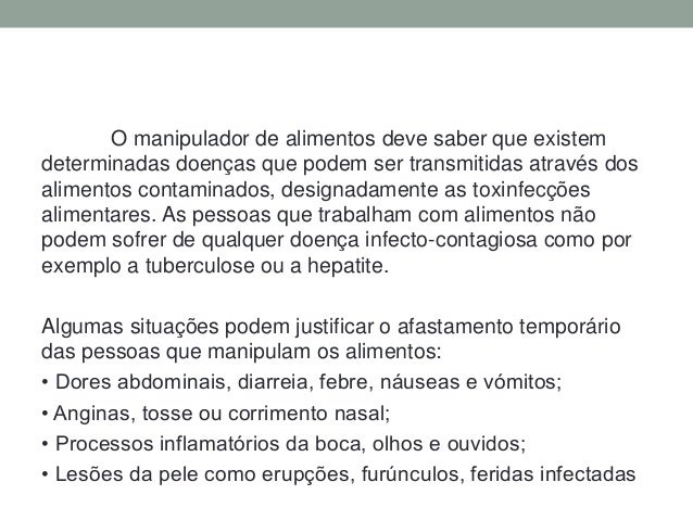 30. 30. O manipulador de alimentos deve saber que existem determinadas doenças que podem ser transmitidas através dos alimentos contaminados, designadamente as toxinfecções alimentares. As pessoas que trabalham com alimentos não podem sofrer de qualquer doença infecto-contagiosa como por exemplo a tuberculose ou a hepatite. Algumas situações podem justificar o afastamento temporário das pessoas que manipulam os alimentos: • Dores abdominais, diarreia, febre, náuseas e vómitos; • Anginas, tosse ou corrimento nasal; • Processos inflamatórios da boca, olhos e ouvidos; • Lesões da pele como erupções, furúnculos, feridas infectadas