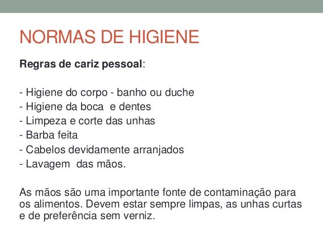 31. 31. NORMAS DE HIGIENE Regras de cariz pessoal: - Higiene do corpo - banho ou duche - Higiene da boca e dentes - Limpeza e corte das unhas - Barba feita - Cabelos devidamente arranjados - Lavagem das mãos. As mãos são uma importante fonte de contaminação para os alimentos. Devem estar sempre limpas, as unhas curtas e de preferência sem verniz.