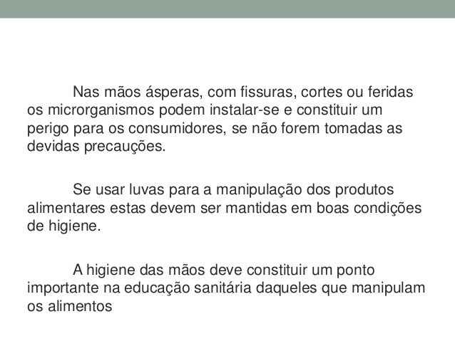 32. 32. Nas mãos ásperas, com fissuras, cortes ou feridas os microrganismos podem instalar-se e constituir um perigo para os consumidores, se não forem tomadas as devidas precauções. Se usar luvas para a manipulação dos produtos alimentares estas devem ser mantidas em boas condições de higiene. A higiene das mãos deve constituir um ponto importante na educação sanitária daqueles que manipulam os alimentos
