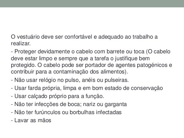 34. 34. O vestuário deve ser confortável e adequado ao trabalho a realizar. - Proteger devidamente o cabelo com barrete ou toca (O cabelo deve estar limpo e sempre que a tarefa o justifique bem protegido. O cabelo pode ser portador de agentes patogénicos e contribuir para a contaminação dos alimentos). - Não usar relógio no pulso, anéis ou pulseiras. - Usar farda própria, limpa e em bom estado de conservação - Usar calçado próprio para a função. - Não ter infecções de boca; nariz ou garganta - Não ter furúnculos ou borbulhas infectadas - Lavar as mãos