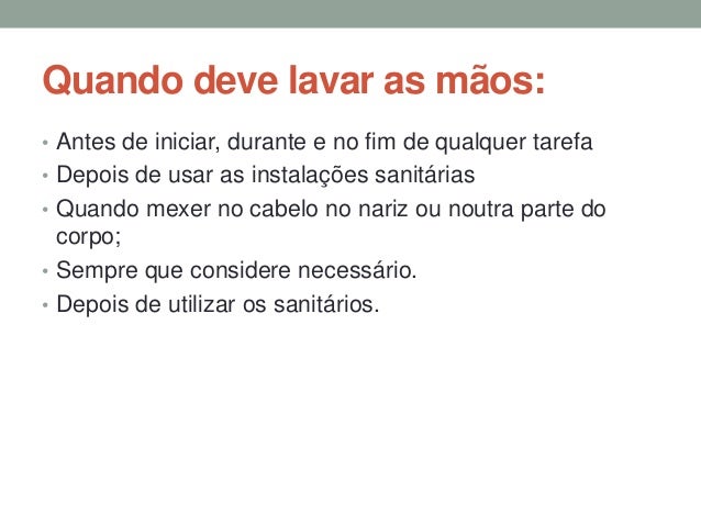 36. 36. Quando deve lavar as mãos: • Antes de iniciar, durante e no fim de qualquer tarefa • Depois de usar as instalações sanitárias • Quando mexer no cabelo no nariz ou noutra parte do corpo; • Sempre que considere necessário. • Depois de utilizar os sanitários.