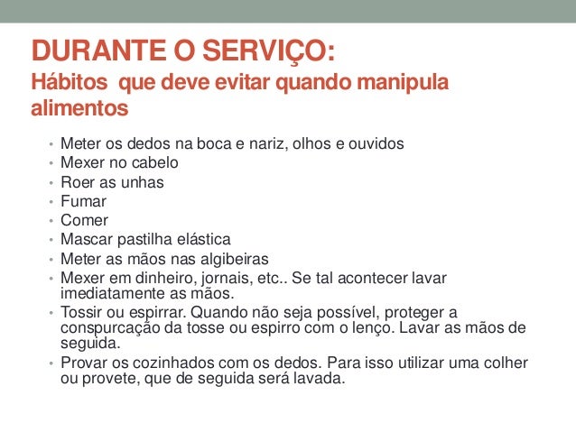 37. 37. DURANTE O SERVIÇO: Hábitos que deve evitar quando manipula alimentos • Meter os dedos na boca e nariz, olhos e ouvidos • Mexer no cabelo • Roer as unhas • Fumar • Comer • Mascar pastilha elástica • Meter as mãos nas algibeiras • Mexer em dinheiro, jornais, etc.. Se tal acontecer lavar imediatamente as mãos. • Tossir ou espirrar. Quando não seja possível, proteger a conspurcação da tosse ou espirro com o lenço. Lavar as mãos de seguida. • Provar os cozinhados com os dedos. Para isso utilizar uma colher ou provete, que de seguida será lavada.