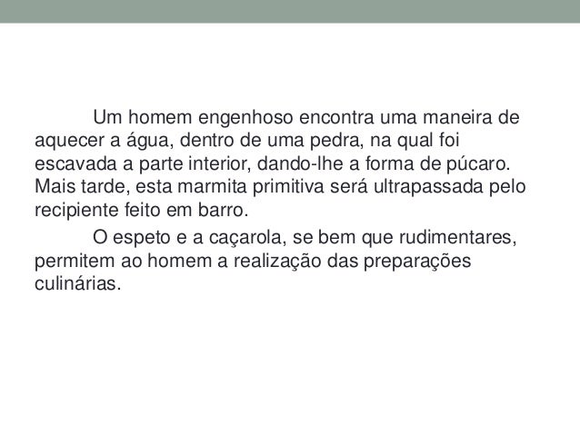 3. 3. Um homem engenhoso encontra uma maneira de aquecer a água, dentro de uma pedra, na qual foi escavada a parte interior, dando-lhe a forma de púcaro. Mais tarde, esta marmita primitiva será ultrapassada pelo recipiente feito em barro. O espeto e a caçarola, se bem que rudimentares, permitem ao homem a realização das preparações culinárias.