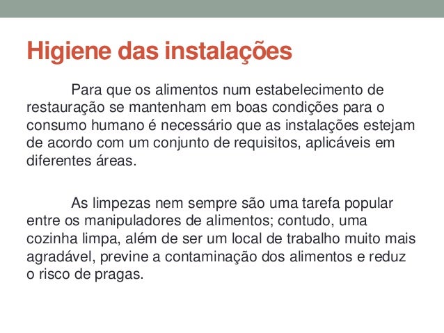 39. 39. Higiene das instalações Para que os alimentos num estabelecimento de restauração se mantenham em boas condições para o consumo humano é necessário que as instalações estejam de acordo com um conjunto de requisitos, aplicáveis em diferentes áreas. As limpezas nem sempre são uma tarefa popular entre os manipuladores de alimentos; contudo, uma cozinha limpa, além de ser um local de trabalho muito mais agradável, previne a contaminação dos alimentos e reduz o risco de pragas.