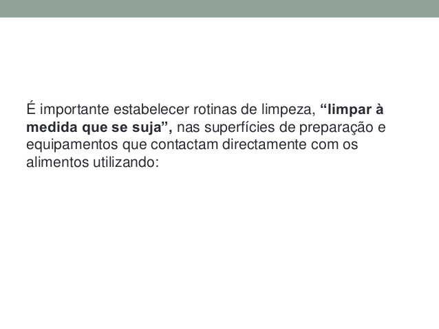 40. 40. É importante estabelecer rotinas de limpeza, “limpar à medida que se suja”, nas superfícies de preparação e equipamentos que contactam directamente com os alimentos utilizando: