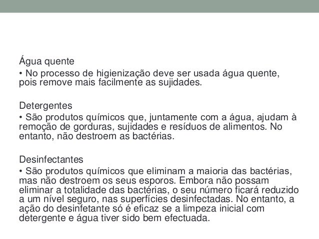 41. 41. Água quente • No processo de higienização deve ser usada água quente, pois remove mais facilmente as sujidades. Detergentes • São produtos químicos que, juntamente com a água, ajudam à remoção de gorduras, sujidades e resíduos de alimentos. No entanto, não destroem as bactérias. Desinfectantes • São produtos químicos que eliminam a maioria das bactérias, mas não destroem os seus esporos. Embora não possam eliminar a totalidade das bactérias, o seu número ficará reduzido a um nível seguro, nas superfícies desinfectadas. No entanto, a ação do desinfetante só é eficaz se a limpeza inicial com detergente e água tiver sido bem efectuada.