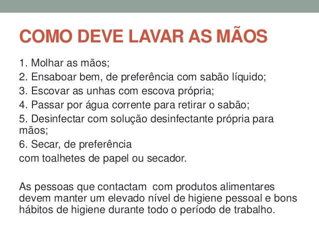 42. 42. COMO DEVE LAVAR AS MÃOS 1. Molhar as mãos; 2. Ensaboar bem, de preferência com sabão líquido; 3. Escovar as unhas com escova própria; 4. Passar por água corrente para retirar o sabão; 5. Desinfectar com solução desinfectante própria para mãos; 6. Secar, de preferência com toalhetes de papel ou secador. As pessoas que contactam com produtos alimentares devem manter um elevado nível de higiene pessoal e bons hábitos de higiene durante todo o período de trabalho.