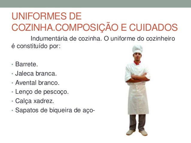 43. 43. UNIFORMES DE COZINHA.COMPOSIÇÃO E CUIDADOS Indumentária de cozinha. O uniforme do cozinheiro é constituído por: • Barrete. • Jaleca branca. • Avental branco. • Lenço de pescoço. • Calça xadrez. • Sapatos de biqueira de aço-