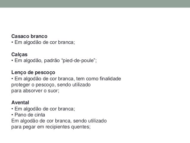 44. 44. Casaco branco • Em algodão de cor branca; Calças • Em algodão, padrão “pied-de-poule”; Lenço de pescoço • Em algodão de cor branca, tem como finalidade proteger o pescoço, sendo utilizado para absorver o suor; Avental • Em algodão de cor branca; • Pano de cinta Em algodão de cor branca, sendo utilizado para pegar em recipientes quentes;
