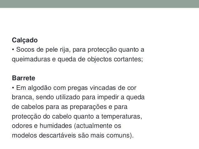 45. 45. Calçado • Socos de pele rija, para protecção quanto a queimaduras e queda de objectos cortantes; Barrete • Em algodão com pregas vincadas de cor branca, sendo utilizado para impedir a queda de cabelos para as preparações e para protecção do cabelo quanto a temperaturas, odores e humidades (actualmente os modelos descartáveis são mais comuns).
