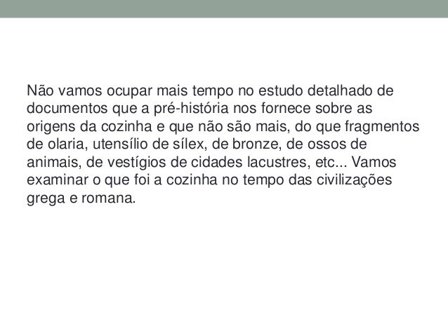 4. 4. Não vamos ocupar mais tempo no estudo detalhado de documentos que a pré-história nos fornece sobre as origens da cozinha e que não são mais, do que fragmentos de olaria, utensílio de sílex, de bronze, de ossos de animais, de vestígios de cidades lacustres, etc... Vamos examinar o que foi a cozinha no tempo das civilizações grega e romana.