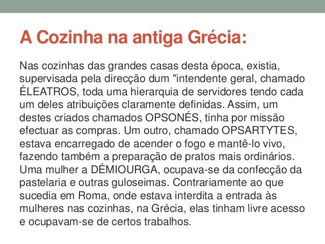 5. 5. A Cozinha na antiga Grécia: Nas cozinhas das grandes casas desta época, existia, supervisada pela direcção dum "intendente geral, chamado ÉLEATROS, toda uma hierarquia de servidores tendo cada um deles atribuições claramente definidas. Assim, um destes criados chamados OPSONÉS, tinha por missão efectuar as compras. Um outro, chamado OPSARTYTES, estava encarregado de acender o fogo e mantê-lo vivo, fazendo também a preparação de pratos mais ordinários. Uma mulher a DÉMIOURGA, ocupava-se da confecção da pastelaria e outras guloseimas. Contrariamente ao que sucedia em Roma, onde estava interdita a entrada às mulheres nas cozinhas, na Grécia, elas tinham livre acesso e ocupavam-se de certos trabalhos.