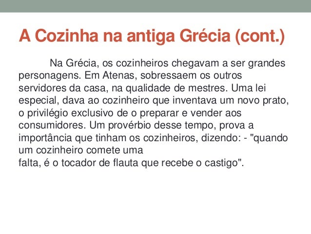 7. 7. A Cozinha na antiga Grécia (cont.) Na Grécia, os cozinheiros chegavam a ser grandes personagens. Em Atenas, sobressaem os outros servidores da casa, na qualidade de mestres. Uma lei especial, dava ao cozinheiro que inventava um novo prato, o privilégio exclusivo de o preparar e vender aos consumidores. Um provérbio desse tempo, prova a importância que tinham os cozinheiros, dizendo: - "quando um cozinheiro comete uma falta, é o tocador de flauta que recebe o castigo".