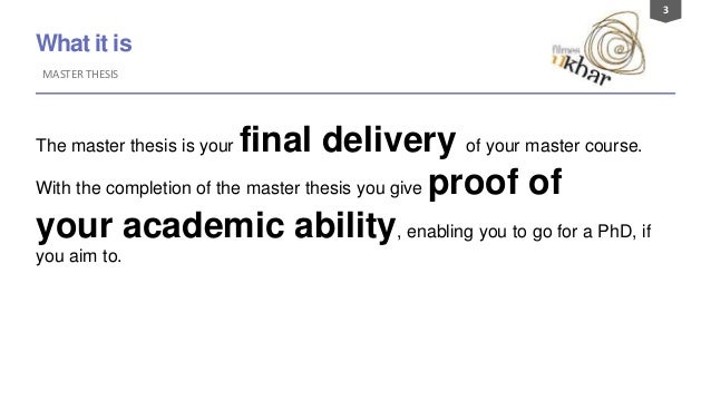 3. 3. 3 What it is MASTER THESIS The master thesis is your final delivery of your master course. With the completion of the master thesis you give proof of your academic ability, enabling you to go for a PhD, if you aim to.