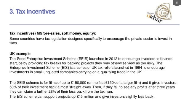 5. 5. 5 3. Tax incentives Tax incentives (MG/pre-sales, soft money, equity): Some countries have tax legislation designed specifically to encourage the private sector to invest in films. UK example The Seed Enterprise Investment Scheme (SEIS) launched in 2012 to encourage investors to finance startups by providing tax breaks for backing projects they may otherwise view as too risky. The Enterprise Investment Scheme (EIS) is a series of UK tax reliefs launched in 1994 to encourage investments in small unquoted companies carrying on a qualifying trade in the UK. The SEIS scheme is for films of up to £150,000 (or the first £150k of a larger film) and it gives investors 50% of their investment back almost straight away. Then, if they fail to see any profits after three years they can claim a further 28% of their loss back from the taxman. The EIS scheme can support projects up £15 million and give investors slightly less back.