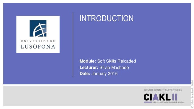 10. 10. ©SílviaMachado2016 INTRODUCTION Module: Soft Skills Reloaded Lecturer: Sílvia Machado Date: January 2016 COURSE CONTENT SUPPORTED BY