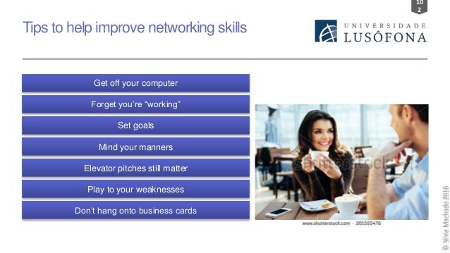 101. 101. ©SílviaMachado2016 10 2 Tips to help improve networking skills Get off your computer Forget you’re “working” Set goals Mind your manners Elevator pitches still matter Play to your weaknesses Don’t hang onto business cards ©SílviaMachado2016