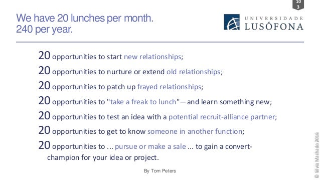 102. 102. ©SílviaMachado2016 10 3 We have 20 lunches per month. 240 per year. 20 opportunities to start new relationships; 20 opportunities to nurture or extend old relationships; 20 opportunities to patch up frayed relationships; 20 opportunities to "take a freak to lunch"—and learn something new; 20 opportunities to test an idea with a potential recruit-alliance partner; 20 opportunities to get to know someone in another function; 20 opportunities to ... pursue or make a sale ... to gain a convert- champion for your idea or project. By Tom Peters ©SílviaMachado2016