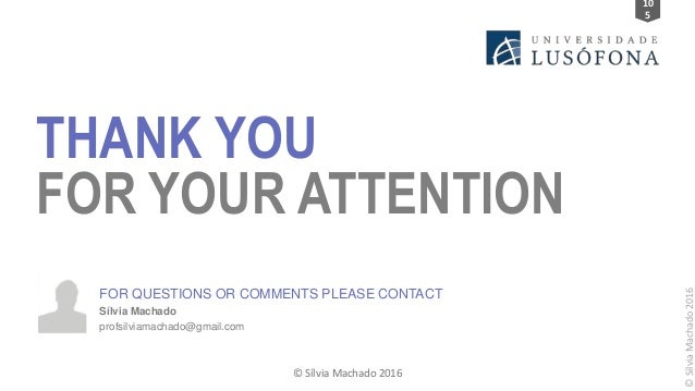 104. 104. ©SílviaMachado2016 10 5 THANK YOU FOR QUESTIONS OR COMMENTS PLEASE CONTACT Sílvia Machado profsilviamachado@gmail.com FOR YOUR ATTENTION © Sílvia Machado 2016