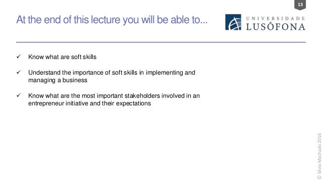 12. 12. ©SílviaMachado2016 13 At the end of this lecture you will be able to...  Know what are soft skills  Understand the importance of soft skills in implementing and managing a business  Know what are the most important stakeholders involved in an entrepreneur initiative and their expectations