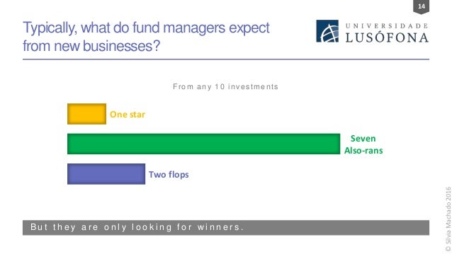 13. 13. ©SílviaMachado2016 14 Typically, what do fund managers expect from new businesses? Two flops Seven Also-rans One star From any 10 investments B u t t h e y a r e o n l y l o o k i n g f o r w i n n e r s .