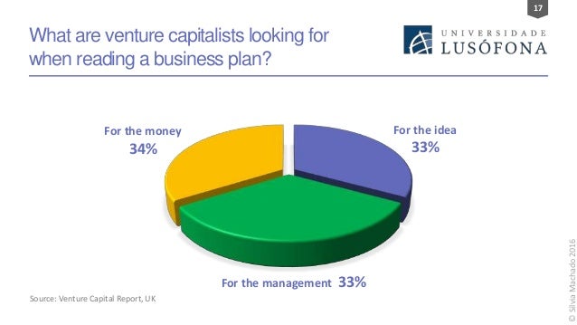 16. 16. ©SílviaMachado2016 17 What are venture capitalists looking for when reading a business plan? For the idea 33% For the management 33% For the money 34% Source: Venture Capital Report, UK