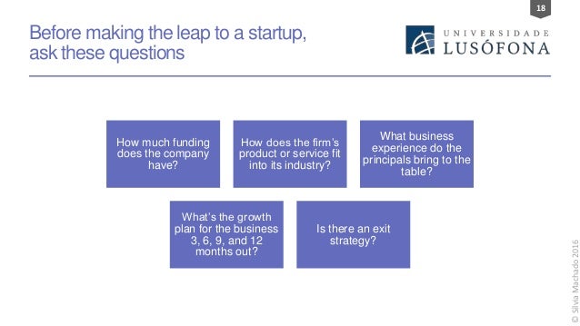 17. 17. ©SílviaMachado2016 18 Before making the leap to a startup, ask these questions How much funding does the company have? How does the firm’s product or service fit into its industry? What business experience do the principals bring to the table? What’s the growth plan for the business 3, 6, 9, and 12 months out? Is there an exit strategy?