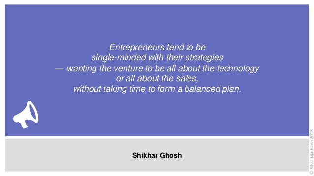 19. 19. ©SílviaMachado2016 Entrepreneurs tend to be single-minded with their strategies — wanting the venture to be all about the technology or all about the sales, without taking time to form a balanced plan. Shikhar Ghosh