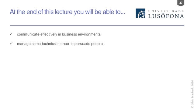 26. 26. ©SílviaMachado2016 27 At the end of this lecture you will be able to...  communicate effectively in business environments  manage some technics in order to persuade people