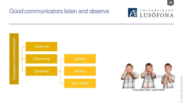 29. 29. ©SílviaMachado2016 30 Good communicators listen and observeSuccessfulcommunication Listening Observing Speaking Speech Writing Non-verbal