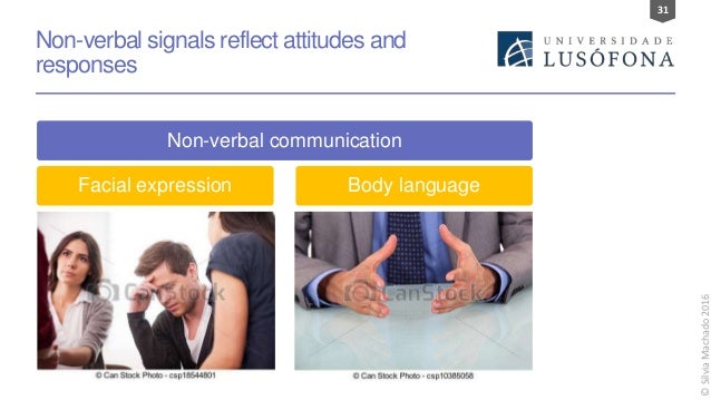 30. 30. ©SílviaMachado2016 31 Non-verbal signals reflect attitudes and responses Non-verbal communication Facial expression Body language