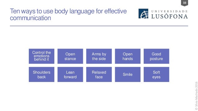 32. 32. ©SílviaMachado2016 33 Ten ways to use body language for effective communication Control the emotions behind it Open stance Arms by the side Open hands Good posture Shoulders back Lean forward Relaxed face Smile Soft eyes