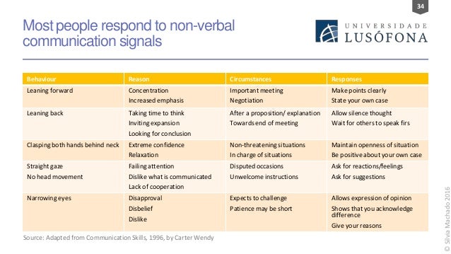 33. 33. ©SílviaMachado2016 34 Most people respond to non-verbal communication signals Behaviour Reason Circumstances Responses Leaning forward Concentration Increased emphasis Important meeting Negotiation Make points clearly State your own case Leaning back Taking time to think Inviting expansion Looking for conclusion After a proposition/ explanation Towards end of meeting Allow silence thought Wait for others to speak firs Clasping both hands behind neck Extreme confidence Relaxation Non-threatening situations In charge of situations Maintain openness of situation Be positive about your own case Straight gaze No head movement Failing attention Dislike what is communicated Lack of cooperation Disputed occasions Unwelcome instructions Ask for reactions/feelings Ask for suggestions Narrowing eyes Disapproval Disbelief Dislike Expects to challenge Patience may be short Allows expression of opinion Shows that you acknowledge difference Give your reasons Source: Adapted from Communication Skills, 1996, by Carter Wendy