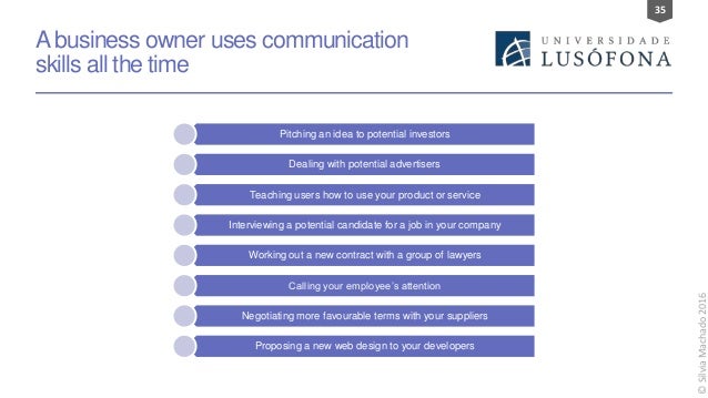 34. 34. ©SílviaMachado2016 35 Abusiness owner uses communication skills all the time Pitching an idea to potential investors Dealing with potential advertisers Teaching users how to use your product or service Interviewing a potential candidate for a job in your company Working out a new contract with a group of lawyers Calling your employee’s attention Negotiating more favourable terms with your suppliers Proposing a new web design to your developers