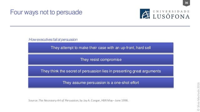 35. 35. ©SílviaMachado2016 36 Four ways not to persuade They attempt to make their case with an up-front, hard sell Howexecutivesfailatpersuasion They resist compromise They think the secret of persuasion lies in presenting great arguments They assume persuasion is a one-shot effort Source: The Necessary Art of Persuasion, by Jay A. Conger, HBR May– June 1998.