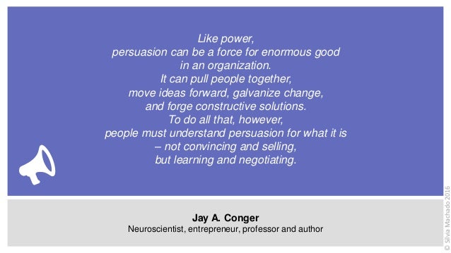 36. 36. ©SílviaMachado2016 Like power, persuasion can be a force for enormous good in an organization. It can pull people together, move ideas forward, galvanize change, and forge constructive solutions. To do all that, however, people must understand persuasion for what it is – not convincing and selling, but learning and negotiating. Jay A. Conger Neuroscientist, entrepreneur, professor and author