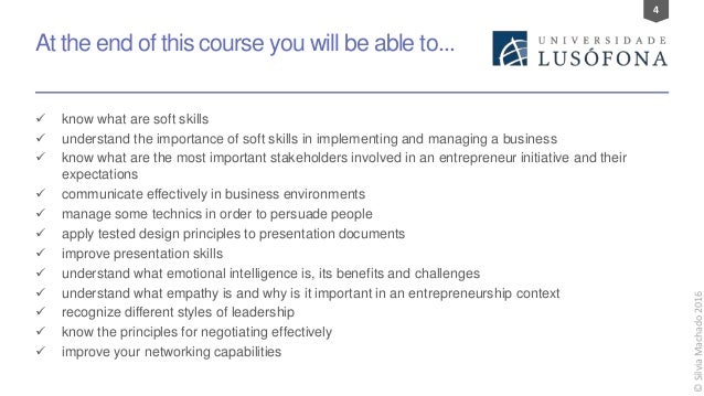 4. 4. ©SílviaMachado2016 4 At the end of this course you will be able to...  know what are soft skills  understand the importance of soft skills in implementing and managing a business  know what are the most important stakeholders involved in an entrepreneur initiative and their expectations  communicate effectively in business environments  manage some technics in order to persuade people  apply tested design principles to presentation documents  improve presentation skills  understand what emotional intelligence is, its benefits and challenges  understand what empathy is and why is it important in an entrepreneurship context  recognize different styles of leadership  know the principles for negotiating effectively  improve your networking capabilities