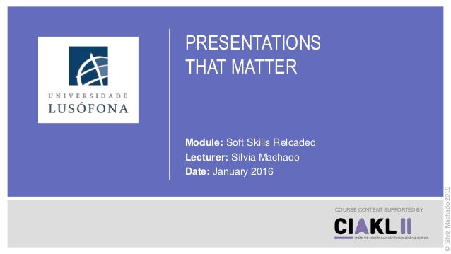 40. 40. ©SílviaMachado2016 PRESENTATIONS THAT MATTER Module: Soft Skills Reloaded Lecturer: Sílvia Machado Date: January 2016 COURSE CONTENT SUPPORTED BY