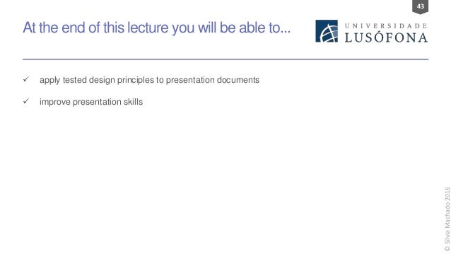 42. 42. ©SílviaMachado2016 43 At the end of this lecture you will be able to...  apply tested design principles to presentation documents  improve presentation skills