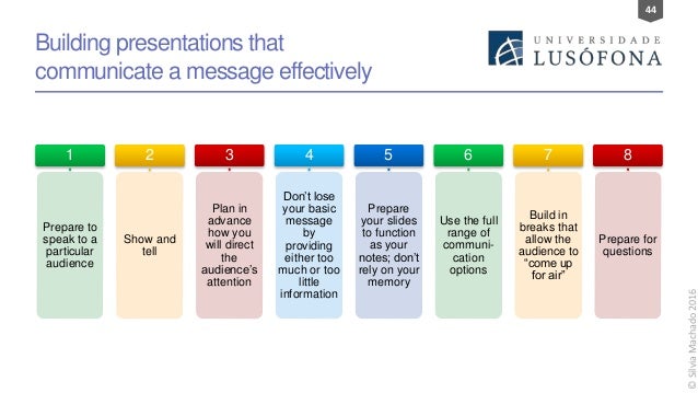43. 43. ©SílviaMachado2016 44 Building presentations that communicate a message effectively 1 Prepare to speak to a particular audience 2 Show and tell 3 Plan in advance how you will direct the audience’s attention 4 Don’t lose your basic message by providing either too much or too little information 5 Prepare your slides to function as your notes; don’t rely on your memory 6 Use the full range of communi- cation options 7 Build in breaks that allow the audience to “come up for air” 8 Prepare for questions