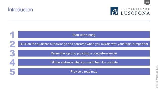 45. 45. ©SílviaMachado2016 46 Introduction Start with a bang Build on the audience’s knowledge and concerns when you explain why your topic is important Define the topic by providing a concrete example Tell the audience what you want them to conclude Provide a road map 1 2 3 4 5