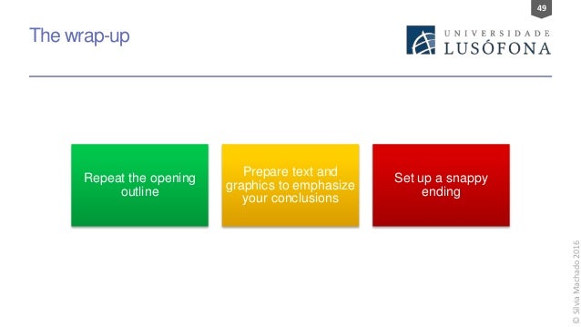 48. 48. ©SílviaMachado2016 49 The wrap-up Repeat the opening outline Prepare text and graphics to emphasize your conclusions Set up a snappy ending