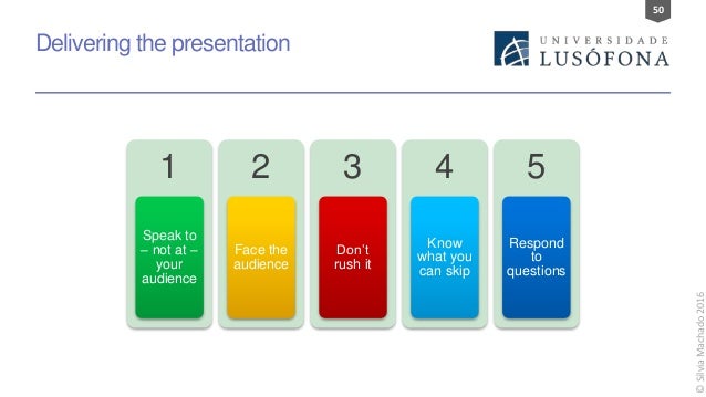 49. 49. ©SílviaMachado2016 50 Delivering the presentation 1 Speak to – not at – your audience 2 Face the audience 3 Don’t rush it 4 Know what you can skip 5 Respond to questions